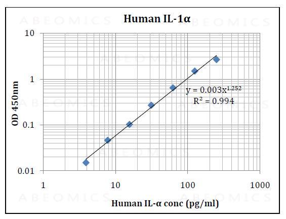 This assay employs an antibody specific for anti-human IL-1α coated on a 96-well plate. Standards and samples are pipetted into the wells and IL-1α present in a sample is bound to the wells by the immobilized antibody. The wells are washed and biotinylated anti-humanIL-1α antibody is added. After washing away unbound biotinylated antibody, HRP-conjugated streptavidin is pipetted to the wells. The wells are again washed, a TMB substrate solution is added to the wells and color develops in proportion to the amount of IL-1α bound. The Stop Solution changes the color from blue to yellow, and the intensity of the color is measured at 450 nm.