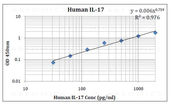 This assay employs an antibody specific for Anti-human IL-17 coated on a 96-well plate. Standards and samples are pipetted into the wells and IL-17 present in a sample is bound to the wells by the immobilized antibody. The wells are washed and biotinylated anti-human IL-17 antibody is added. After washing away unbound biotinylated antibody, HRP-conjugated streptavidin is pipetted to the wells. The wells are again washed, a TMB substrate solution is added to the wells and color develops in proportion to the amount of IL-17 bound. The Stop Solution changes the color from blue to yellow, and the intensity of the color is measured at 450 nm.