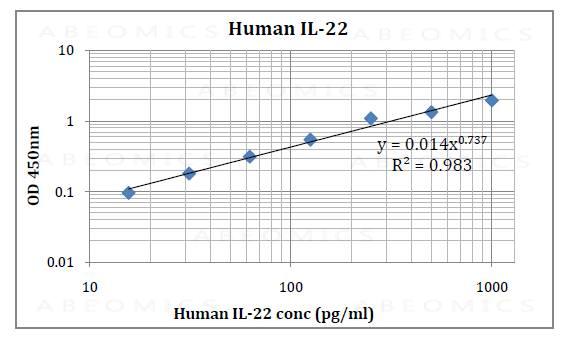 This assay employs an antibody specific for Anti-human IL-22 coated on a 96-well plate. Standards and samples are pipetted into the wells and IL-22 present in a sample is bound to the wells by the immobilized antibody. The wells are washed and biotinylated anti-human IL-22 antibody is added. After washing away unbound biotinylated antibody, HRP-conjugated streptavidin is pipetted to the wells. The wells are again washed, a TMB substrate solution is added to the wells and color develops in proportion to the amount of IL-22 bound. The Stop Solution changes the color from blue to yellow, and the intensity of the color is measured at 450 nm.