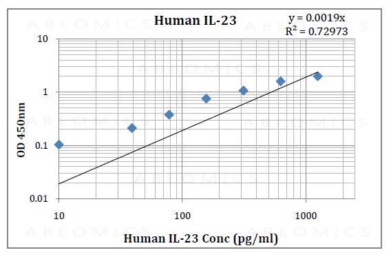 This assay employs an antibody specific for Anti-human IL-23 coated on a 96-well plate. Standards and samples are pipetted into the wells and IL-23 present in a sample is bound to the wells by the immobilized antibody. The wells are washed and biotinylated anti-human IL-23 antibody is added. After washing away unbound biotinylated antibody, HRP-conjugated streptavidin is pipetted to the wells. The wells are again washed, a TMB substrate solution is added to the wells and color develops in proportion to the amount of IL-23 bound. The Stop Solution changes the color from blue to yellow, and the intensity of the color is measured at 450 nm.