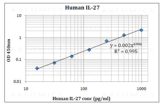 This assay employs an antibody specific for Anti-human IL-27 coated on a 96-well plate. Standards and samples are pipetted into the wells and IL-27 present in a sample is bound to the wells by the immobilized antibody. The wells are washed and biotinylated anti-human IL-27 antibody is added. After washing away unbound biotinylated antibody, HRP-conjugated streptavidin is pipetted to the wells. The wells are again washed, a TMB substrate solution is added to the wells and color develops in proportion to the amount of IL-27 bound. The Stop Solution changes the color from blue to yellow, and the intensity of the color is measured at 450 nm.