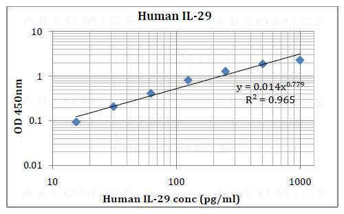 This assay employs an antibody specific for Anti-human IL-29 coated on a 96-well plate. Standards and samples are pipetted into the wells and IL-29 present in a sample is bound to the wells by the immobilized antibody. The wells are washed and biotinylated anti-humanIL-29 antibody is added. After washing away unbound biotinylated antibody, HRP-conjugated streptavidin is pipetted to the wells. The wells are again washed, a TMB substrate solution is added to the wells and color develops in proportion to the amount of IL-29 bound. The Stop Solution changes the color from blue to yellow, and the intensity of the color is measured at 450 nm.
