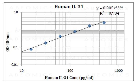 This assay employs an antibody specific for Anti-human IL-31 coated on a 96-well plate. Standards and samples are pipetted into the wells and IL-31 present in a sample is bound to the wells by the immobilized antibody. The wells are washed and biotinylated anti-human IL-31 antibody is added. After washing away unbound biotinylated antibody, HRP-conjugated streptavidin is pipetted to the wells. The wells are again washed, a TMB substrate solution is added to the wells and color develops in proportion to the amount of IL-31 bound. The Stop Solution changes the color from blue to yellow, and the intensity of the color is measured at 450 nm.