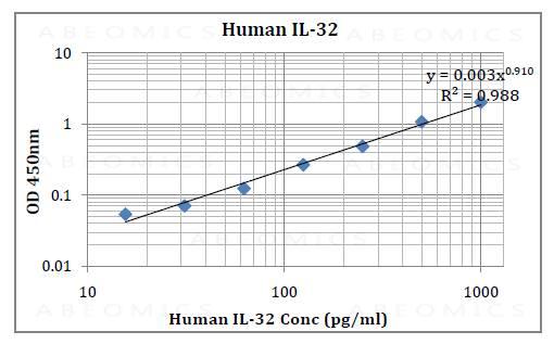 This kit was based on sandwich enzyme-linked immune-sorbent assay technology. Anti- Human IL-32 antibody was pre-coated into 96-well plates. Biotin conjugated anti-human IL-32 detection antibody was used. Standards, test samples and biotin conjugated detection antibody were added to the wells subsequently. Wash buffer was used to wash any non-specific binding. HRP conjugated Streptavidin was used as secondary antibody. TMB substrates were used to visualize HRP enzymatic reaction. TMB was catalyzed by HRP to produce a blue color product that changed into yellow after adding acidic stop solution. The density of yellow is proportional to the Human IL-32 amount of samples captured in the plate. Optical Density (O.D) can be read at absorbance 450nm in a microplate reader. Concentration of Human IL-32 can be calculated using the standard curve.