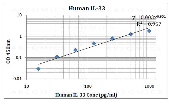 This assay employs an antibody specific for Anti-human IL-33 coated on a 96-well plate. Standards and samples are pipetted into the wells and IL-33 present in a sample is bound to the wells by the immobilized antibody. The wells are washed and biotinylated anti-human IL-33 antibody is added. After washing away unbound biotinylated antibody, HRP-conjugated streptavidin is pipetted to the wells. The wells are again washed, a TMB substrate solution is added to the wells and color develops in proportion to the amount of IL-33 bound. The Stop Solution changes the color from blue to yellow, and the intensity of the color is measured at 450 nm.