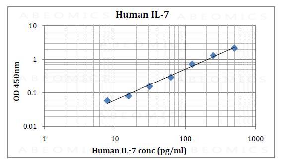 This assay employs an antibody specific for Anti-human IL-7 coated on a 96-well plate. Standards and samples are pipetted into the wells and IL-7 present in a sample is bound to the wells by the immobilized antibody. The wells are washed and biotinylated anti-human IL-7antibody is added. After washing away unbound biotinylated antibody, HRP-conjugated streptavidin is pipetted to the wells. The wells are again washed, a TMB substrate solution is added to the wells and color develops in proportion to the amount of IL-7 bound. The Stop Solution changes the color from blue to yellow, and the intensity of the color is measured at 450 nm.