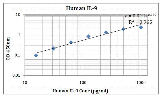 This assay employs an antibody specific for Anti-human IL-9 coated on a 96-well plate. Standards and samples are pipetted into the wells and IL-9 present in a sample is bound to the wells by the immobilized antibody. The wells are washed and biotinylated anti-human IL-9 antibody is added. After washing away unbound biotinylated antibody, HRP-conjugated streptavidin is pipetted to the wells. The wells are again washed, a TMB substrate solution is added to the wells and color develops in proportion to the amount of IL-9 bound. The Stop Solution changes the color from blue to yellow, and the intensity of the color is measured at 450 nm.