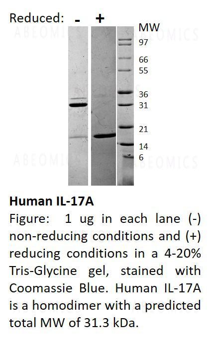Interleukin 17A (IL-17A), also known as CTLA-8, is a member of the IL-17 family of proteins. IL-17A is a proinflammatory cytokine that is secreted by activated CD4+ and CD8+ T lymphocytes. IL-17A acts through its receptor, IL-17R, to promote increased cytokine and chemokine secretion. In turn, the cytokines and chemokines mediate the immunoregulatory function of IL-17A by promoting the proliferation, maturation, and chemoattraction of neutrophils to inflammatory sites. Elevated levels of IL-17A are associated with rheumatoid arthritis, airway inflammation, allograft rejection, inflammatory bowel disease, psoriasis, cancer, and multiple sclerosis. Human, mouse, and rat IL-17A show activity on mouse cells. Â
