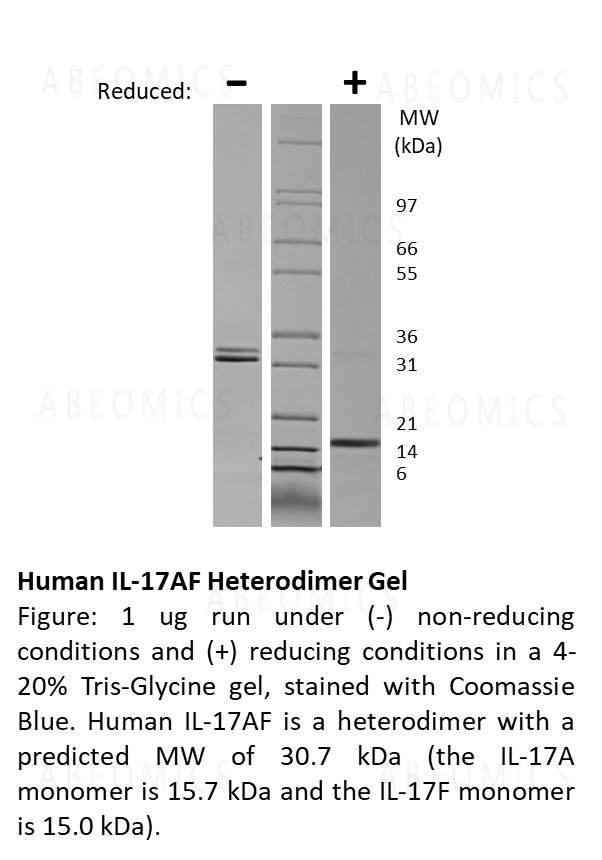 Interleukin 17AF (IL-17AF) is a heterodimer that is composed of the interleukin 17A (IL-17A) and interleukin 17F (IL-17F) members of the IL-17 family of cytokines. IL-17AF is produced by T helper 17 cells (Th17) following interleukin 23 (IL-23) stimulation. IL-17AF signals through the IL-17RA/IL-17RC receptor complex and functions to regulate inflammatory responses. IL-17AF induces chemokine and airway neutrophilia production, similar in function to IL-17A and IL-17F homodimers. In regard to these functions, IL-17AF is less active than the IL-17A homodimer and shows greater activity than the IL-17F homodimer. Human and rat IL-17AF are active on mouse cells.