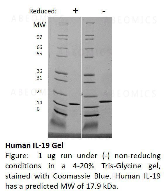 Interleukin-19 (IL-19) is a member of the interleukin 10 (IL-10) cytokine family and is produced by B cells and monocytes. IL-19 binds the interleukin 20 receptor complex (IL-20R) to activate STAT3 signaling. IL-19 induces interleukin 6 (IL-6) and tumor necrosis factor alpha (TNF-a) expression in monocytes, and promotes T helper 2 (Th2) cell-mediated immune responses. IL-19 production is up-regulated in resting monocytes following granulocyte-macrophage colony-stimulating factor (GM-CSF) or lipopolysaccharide (LPS) stimulation.