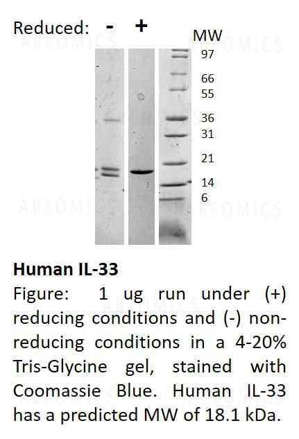 Interleukin 33 (IL-33) is a member of the IL-1 cytokine family and is constitutively expressed in smooth muscle and airway epithelial cells. IL-33 signals through the interleukin 1 receptor-like 1 (IL-1R1) and interleukin-1 receptor accessory protein (IL1RAP) receptors to ativate NF-kB and MAPK signaling pathways. IL-33 functions to induce type 2 cytokine production in polarized Type 2 helper T (Th2) cells.