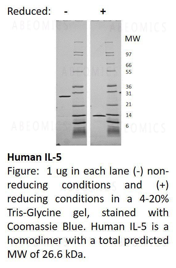 Interleukin 5 (IL-5) is a hematopoietic growth factor that is expressed in type 2 T helper (Th2) cells, mast cells, and eosinophils. IL-5 acts through the IL-5 receptor (IL-5R), stimulates B cell growth, and mediates eosinophil activation. Human and mouse IL-5 show cross-reactivity.
