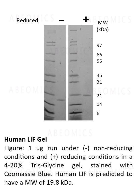 Leukemia inhibitory factor (LIF) is a member of the interleukin 6 (IL-6) family that is made by a variety of adult and embryonic tissues. LIF signals through the glycoprotein 130 (gp130)/LIF receptor (LIFR) heterodimer to activate STAT3 and MAPK signaling. LIF functions during hematopoietic differentiation, neuronal cell differentiation, kidney development, and inflammatory processes. Human LIF may also be an important factor during human embryonic stem cell (hESC) self-renewal, pluripotency, and embryonic implantation.
