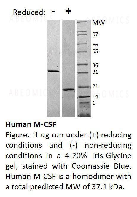 Macrophage colony stimulating factor (M-CSF) is a hematopoietic growth factor that is widely produced by a variety of cells. M-CSF stimulates the proliferation and differentiation of hematopoietic stem cells into monocyte and macrophage cell types. M-CSF also acts through the colony stimulating factor 1 receptor (CSF1R) to modulate processes involved in immunology, bone metabolism, fertility, and pregnancy. Human M-CSF shows activity on mouse cells; however, mouse M-CSF shows no activity on human cells.