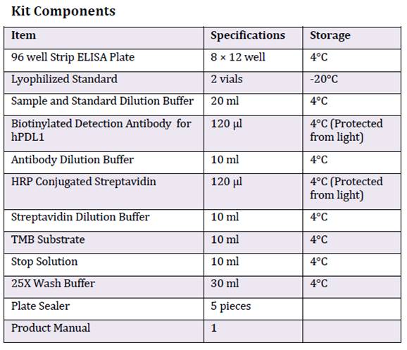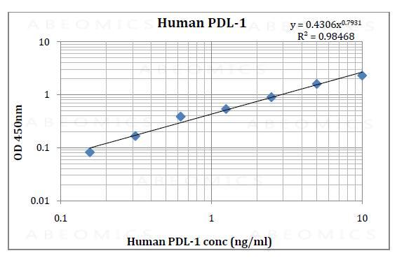 This assay employs an antibody specific for Anti-human PD-L1 coated on a 96-well plate. Standards and samples are pipetted into the wells and PD-L1 present in a sample is bound to the wells by the immobilized antibody. The wells are washed and biotinylated anti-human PD-L1 antibody is added. After washing away unbound biotinylated antibody, HRP-conjugated streptavidin is pipetted to the wells. The wells are again washed, a TMB substrate solution is added to the wells and color develops in proportion to the amount of PD-L1 bound. The Stop Solution changes the color from blue to yellow, and the intensity of the color is measured at 450 nm.
