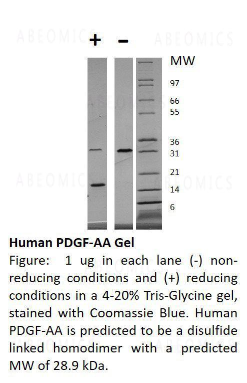 Platelet-derived growth factor (PDGF) is an important regulator of cell growth, proliferation, and angiogenesis. Â PDGF synthesis is induced by IL-1, IL-6, TNF-alpha, TGF-beta and EGF signaling. Â PDGF functions as a mitogenic growth hormone on cells of mesenchymal lineage, such as smooth muscle and glial cells. Â PDGF is also stored in the alpha-granules of platelets and is released upon adherence to traumatized tissues. Â PDGF is a dimeric glycoprotein formed by two A chains (AA), two B chains (BB), or as a heterodimer with an A and a B chain (AB). Â The PDGF dimer binds the cell surface receptor tyrosine kinases PDGFR-alpha and PDGFR-beta .Â