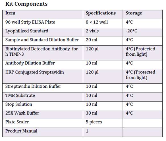 This assay employs an antibody specific for Anti-human TIMP-3 coated on a 96-well plate. Standards and samples are pipetted into the wells and TIMP-3 present in a sample is bound to the wells by the immobilized antibody. The wells are washed and biotinylated anti-human TIMP-3 antibody is added. After washing away unbound biotinylated antibody, HRP-conjugated streptavidin is pipetted to the wells. The wells are again washed, a TMB substrate solution is added to the wells and color develops in proportion to the amount of TIMP-3 bound. The Stop Solution changes the color from blue to yellow, and the intensity of the color is measured at 450 nm.
