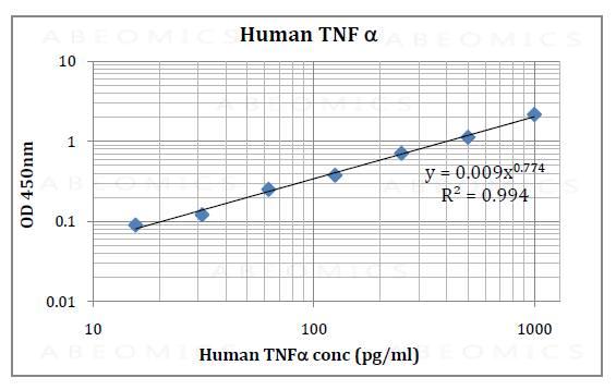 This assay employs an antibody specific for Anti-human TNFα coated on a 96-well plate. Standards and samples are pipetted into the wells and TNFα present in a sample is bound to the wells by the immobilized antibody. The wells are washed and biotinylated anti-human TNFα antibody is added. After washing away unbound biotinylated antibody, HRP-conjugated streptavidin is pipetted to the wells. The wells are again washed, a TMB substrate solution is added to the wells and color develops in proportion to the amount of TNFα bound. The Stop Solution changes the color from blue to yellow, and the intensity of the color is measured at 450 nm.