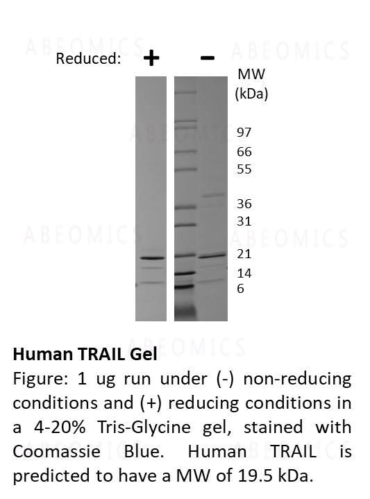 Tumor necrosis factor-related apoptosis-inducing ligand (TRAIL) is a member of the tumor necrosis factor (TNF) family of cytokines. Â TRAIL is widely produced by a variety of cell types including tumor cells, smooth muscle of the lung and spleen, cerebellar glial cells, and thyroid follicular cells. Â TRAIL is a cytotoxic protein that induces apoptosis in tumor cells through the activation of the death receptors DR4 and DR5. Â TRAIL also binds the neutralizing decoy receptors, DcR1 and DcR2. Human TRAIL is active on mouse cells. Â