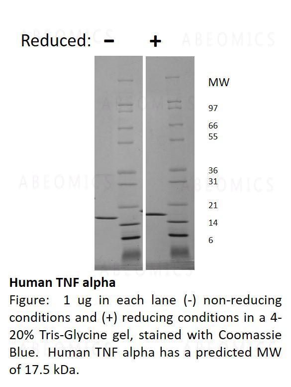 Biological Activity was determined by Cytolysis of mouse L929 cells in the presence of Actinomycin D at <=2 ng/mL; >= 5.0 x 10^5 units/mg. Centrifuge vial before opening, Suspend the product by gently pipetting the above recommended solution down the sides of the vial. DO NOT VORTEX. Allow several minutes for complete reconstitution. For prolonged storage, dilute to working aliquots in a 0.1% BSA solution, store at -80°C and avoid repeat freeze thaws. Upon reconstitution, a small amount of visible precipitate can be expected. A 10% overfill has been added to the total material vialed to compensate for this loss.