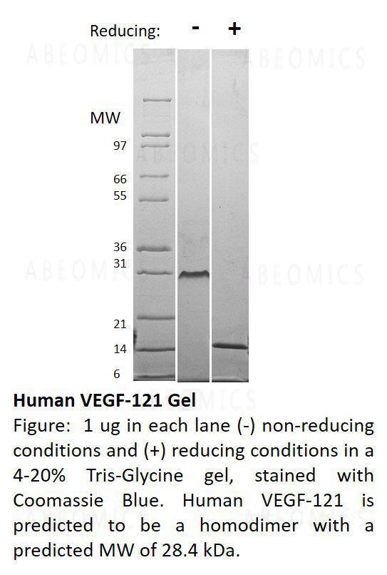 Vascular endothelial growth factor-A (VEGF-A) is produced by a wide variety of cell types, including tumor and vascular cells. VEGF-A is a mediator of vascular growth, vascular permeability, and plays a role in stimulating vasodilation via nitric oxide-dependent pathways. VEGF-A has several alternatively spliced isoforms, with one being VEGF-121. The VEGF-121 isoform is a secreted protein that acts on receptors VEGFR-1 and VEGFR-2 to modulate endothelial cell function.