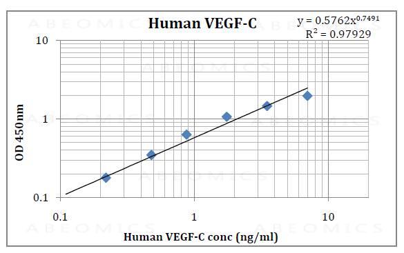 This assay employs an antibody specific for Anti-human VEGF-C coated on a 96-well plate. Standards and samples are pipetted into the wells and VEGF-C present in a sample is bound to the wells by the immobilized antibody. The wells are washed and biotinylated anti-human VEGF-C antibody is added. After washing away unbound biotinylated antibody, HRP-conjugated streptavidin is pipetted to the wells. The wells are again washed, a TMB substrate solution is added to the wells and color develops in proportion to the amount of VEGF-C bound. The Stop Solution changes the color from blue to yellow, and the intensity of the color is measured at 450 nm.