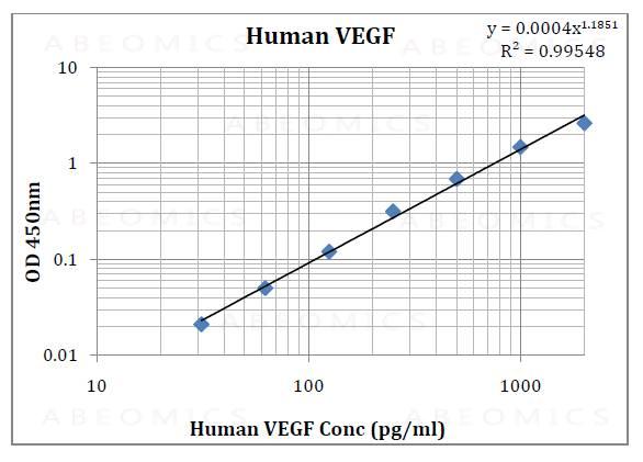 This assay employs an antibody specific for Anti-human VEGF coated on a 96-well plate. Standards and samples are pipetted into the wells and VEGF present in a sample is bound to the wells by the immobilized antibody. The wells are washed and biotinylated anti-human VEGF antibody is added. After washing away unbound biotinylated antibody, HRP-conjugated streptavidin is pipetted to the wells. The wells are again washed, a TMB substrate solution is added to the wells and color develops in proportion to the amount of VEGF bound. The Stop Solution changes the color from blue to yellow, and the intensity of the color is measured at 450 nm.