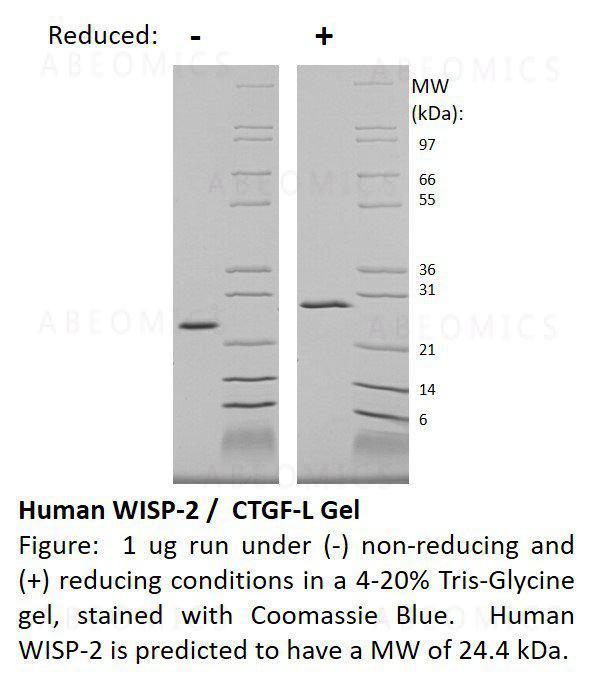 WNT1-inducible-signaling pathway protein 2 (WISP-2) is a member of the CYR61/CTGF/NOV (CCN) family of regulatory factors. WISP-2 is expressed in ectodermal, mesodermal, and endodermal lineages, including primary osteoblasts, fibroblasts, mesenchymal stem cells, and adipogenic precursor cells. WISP-2 is a canonical WNT ligand that regulates cell proliferation, adhesion, and metastasis. Secreted WISP-2 promotes mesenchymal precursor cell proliferation and maintains them in an undifferentiated state. In bone-forming osteoblasts, WISP-2 promotes osteoblast adhesion and inhibits osteocalcin production.