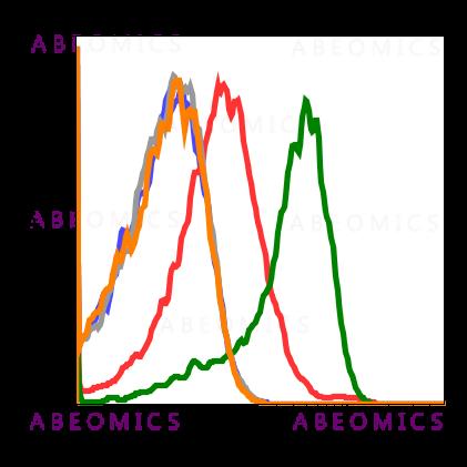 Fig-1: KLH-G9 does not show non-specific binding to human cells. Flow cytometric analysis of Jurkat cells secondary antibody only (blue) or untreated (grey) or treated with anisomycin (orange) using isotype control antibody KLH-G9 compared to untreated (red) or treated with anisomycin (green) using Phospho-ATF-2 (T71) antibody ATF2T71-G3 both tested at 0.1 µg/mL.