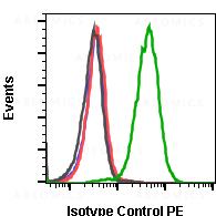 Fig-1: Flow cytometric analysis of U937 cells using rabbit (G9) mAb Isotype Control (PE Conjugate) for untreated (blue) or treated with IFNa (Red) compared to Phospho-Src (Tyr416) (C4) rabbit mAb (PE conjugate) untreated (black) or IFNa treated (green).
