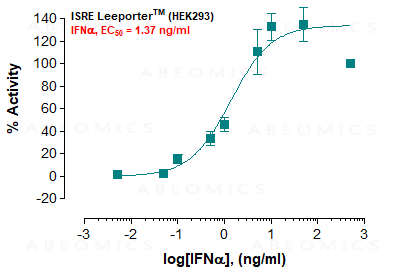 The ISRE Leeporter™ Luciferase Reporter cell line is a stably transfected HEK293 cell line which expresses Renilla luciferase reporter gene under the transcriptional control of the Interferon-Stimulated Response Element (ISRE). Activation of the reporter cell line triggers phosphorylation of interferon regulatory factors (IRFs). The phosphorylated IRFs can then translocate to the nucleus, bind to ISRE, and lead to the Renilla luciferase reporter protein expression. Functional activity of the cell line has been validated by IFN-alpha (Figure 1).