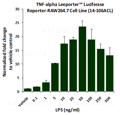 Fig-1: Induction of TNF-alpha promoter activity mediated by LPS-stimulated TLR4. TNF-alpha Leeporter™ Luciferase Reporter-RAW264.7 Cells (Abeomics, Cat. No. 14-106ACL) were treated with different concentrations of LPS (15-1030) for 16 h, and then luciferase activity was measured.