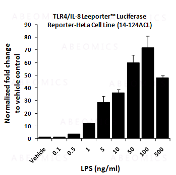 Fig-1: Induction of human TLR4 activity by LPS. TLR4/IL-8 Leeporter™ Luciferase Reporter-HeLa Cells (Abeomics, Cat. No. 14-124ACL) were treated with different concentrations of LPS (15-1013) for 6 h, and then luciferase activity was measured.