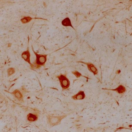 Figure-1: Immunohistochemistry of a section of rat facial nucleus 7 days following axotomy. These neurons are capable of regenerating their axons and also, concomitant with regeneration, strongly upregulate α-internexin in their perikarya. Other central neurons which are not able to regenerate their axons do not upregulate this protein after axotomy and untreated facial neurons normally show only very low levels of α-internexin. Both findings suggest that α-internexin has a role in axonal regeneration.