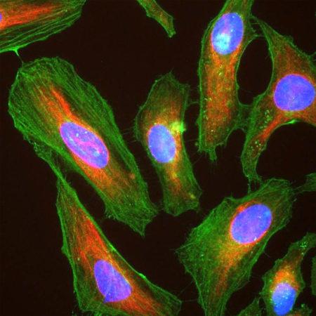 Figure-1: Immunofluorescent analysis of HeLa cells stained with mAb against actin,(34-1002), in green, costained with chicken pAb against vimentin,(34-1126), in red. The actin antibody labels the submembranous actin-rich cytoskeleton, stress fibers and bundles of actin associated with cell adhesion sites. The vimentin antibody stains a different cytoskeletal network, the intermediate or 10nm filaments. The blue is DAPI staining of nuclear DNA.