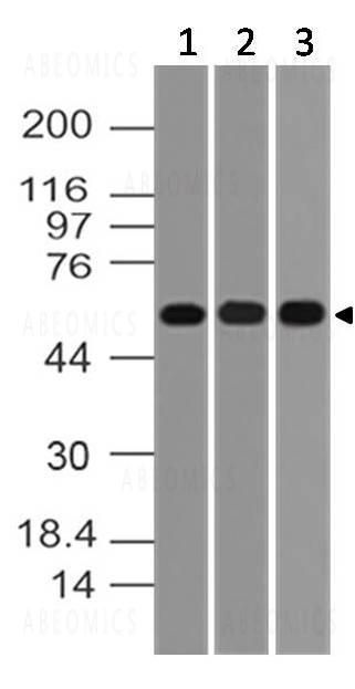 Fig-1: Western blot analysis of AKT1. Anti- AKT1 antibody (Clone: ABM12F7) was tested at 2 µg/ml on SKBR3, PC3 and BT474.