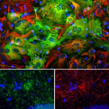 Figure-1: Immunofluorescent analysis of mixed cortical neuron-glial cell culture from an E20 rat stained with mouse mAb to aldehyde dehydrogenase family 1 member L1 (ALDH1L1), (34-1004), dilution 1:1,000 in green, and costained with chicken pAb to vimentin,(34-1126), dilution 1:5,000 in red. The blue is DAPI staining of nuclear DNA. (34-1004) antibody produces strong cytoplasmic staining of astrocytic glial cells, while the(34-1126) antibody labels the intermediate filament cytoskeleton in fibroblasts and other glial cells. Some cells, presumably developing asrocytes, are stained by both ALDH1L1 and vimentin and so appear yellow.