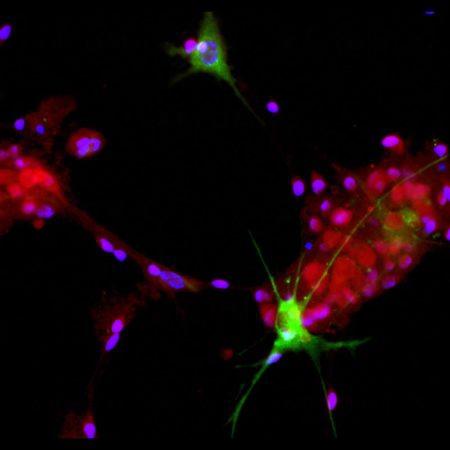 Figure-1: View of mixed neuron/glial cultures stained with (34-1007) (green) and our rabbit antibody to NeuN/FOX3 antibody (34-1036 red). (34-1007) antibody reveals strong cytoplasmic staining in astrocytes, while the Fox3/NeuN antibody shows nuclear and distal cytoplasmic staining in neuron cells and is complete absence of astrocytes. Blue is a DNA stain.