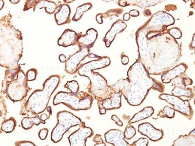 Formalin-fixed, paraffin-embedded human Placenta stained with PLAP Monoclonal Antibody (GM022).
