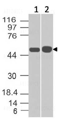 Figure-1: Expression analysis of Antitrypsin. Antitrypsin antibody (Clone: ABM48F6) was tested at 1 µg/ml on (1) Snu1 and (2) Hela Lysates.