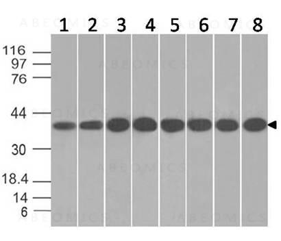 Figure-1: Western blot analysis of Annexin I. Anti-Annexin I antibody (Clone: ABM5D80) was used at 0.01 µg/ml on (1) MCF-7, (2) PC3, (3) A431, (4) U87, (5) A549, (6) Hela, (7) PANC-1 and (8) K562 lysates.