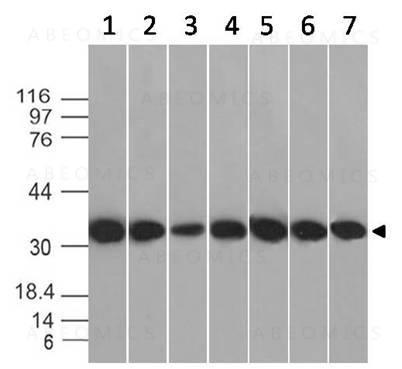 Figure-1: Western blot analysis of Annexin V. Anti-Annexin V antibody (Clone: ABM4C5.2B4) was used at 0.01 µg/ml on (1) U87, (2) MCF-7, (3) Jurkat, (4) K562, (5) Hela, (6) HepG2 and (7) 3T3 lysates.