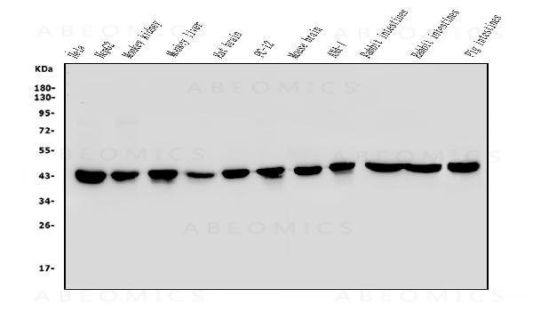 Figure 1. Western blot analysis of beta-Actin using anti-beta-Actin antibody. Electrophoresis was performed on a 5-20% SDS-PAGE gel at 70V (Stacking gel) / 90V (Resolving gel) for 2-3 hours. The sample well of each lane was loaded with 50µg of sample under reducing conditions. Lane 1: human Hela whole cell lysates, Lane 2: human HepG2 whole cell lysates, Lane 3: monkey kidney tissue lysates, Lane 4: monkey liver tissue lysates, Lane 5: rat brain tissue lysates, Lane 6: rat PC-12 whole cell lysates, Lane 7: mouse brain tissue lysates, Lane 8: mouse ANA-1 whole cell lysates, Lane 9: rabbit intestine tissue lysates, Lane 10: rabbit intestine tissue lysates, Lane 11: pig intestine tissue lysates.