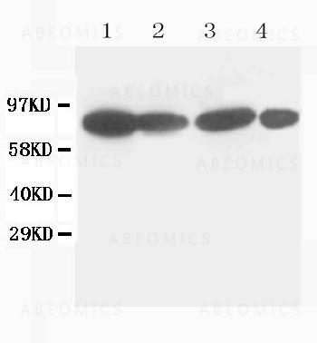 Figure 1: Anti-Catenin gamma(Plakoglobin) monoclonal antibody(39-1011). Western blotting: Lane 1: MCF-7 Cell Lysate, Lane 2: HELA Cell Lysate , Lane 3: MM231 Cell Lysate, Lane 4: HT1080 Cell Lysate.