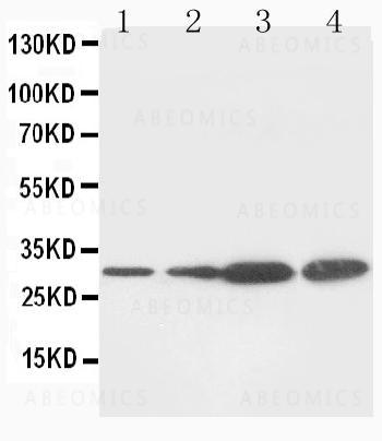 Figure 1: Anti-PCNA antibody(monoclonal) 39-1086. Western blotting: Lane 1: MCF-7 Cell Lysate, Lane 2: HELA Cell Lysate, Lane 3: HT1080 Cell Lysate, Lane 4: COLO320 Cell Lysate.