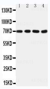 Figure 1: Anti-Tau antibody(monoclonal) 39-1093. Western blotting: Lane 1: Rat Brain Tissue Lysate, Lane 2: Rat Brain Tissue Lysate, Lane 3: Mouse Brain Tissue Lysate, Lane 4: Mouse Brain Tissue Lysate.