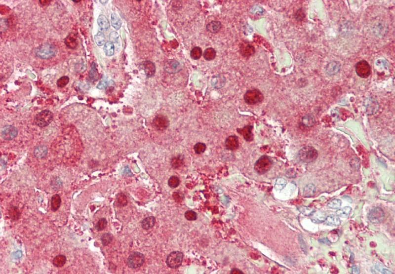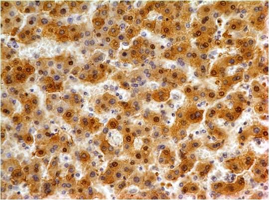Fig-1: Immunohistochemical (Formalin Fixed paraffin-embedded) analysis of Arginase-1 in human liver tissue using Arginase-1 antibody (Clone: ABM4B35) at 15 µg/ml.