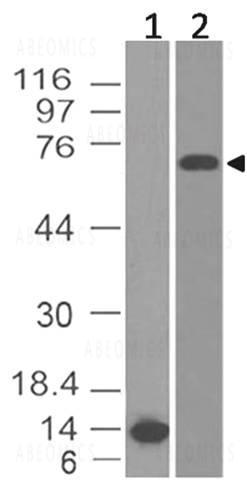 Fig-1: Western blot analysis of BCL-6. Anti- BCL-6 antibody (Clone: ABM44G9) was tested at 0.5 µg/ml and 2 µg/ml on (1) recombinant protein and (2) human brain lysates respectively