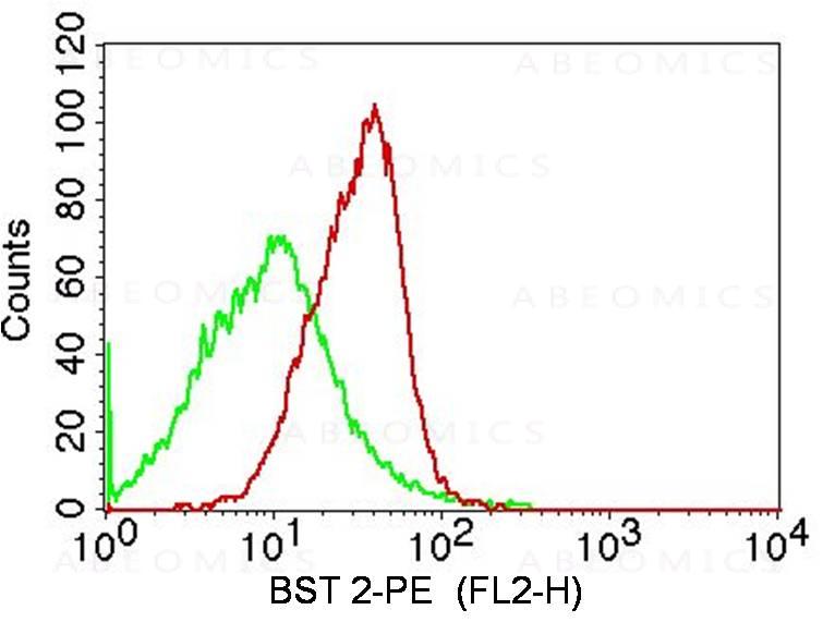 Fig-1: Cell surface flow analysis of BST2 in PBMCs (lymphocytes gated) using 0.5 µg/10^6 cells of antibody (Clone: ABM52D8). Green represents isotype control; red represents anti-BST2 antibody. Goat anti-mouse PE conjugate was used as secondary antibody. (Cells were incubated with primary antibody for 45 min. then washed twice with PBS by centrifuging at 1100 rpm for 5 min, followed by 30 min incubation with conjugated secondary antibody. Data acquisition was done after washing twice with PBS as mentioned above).
