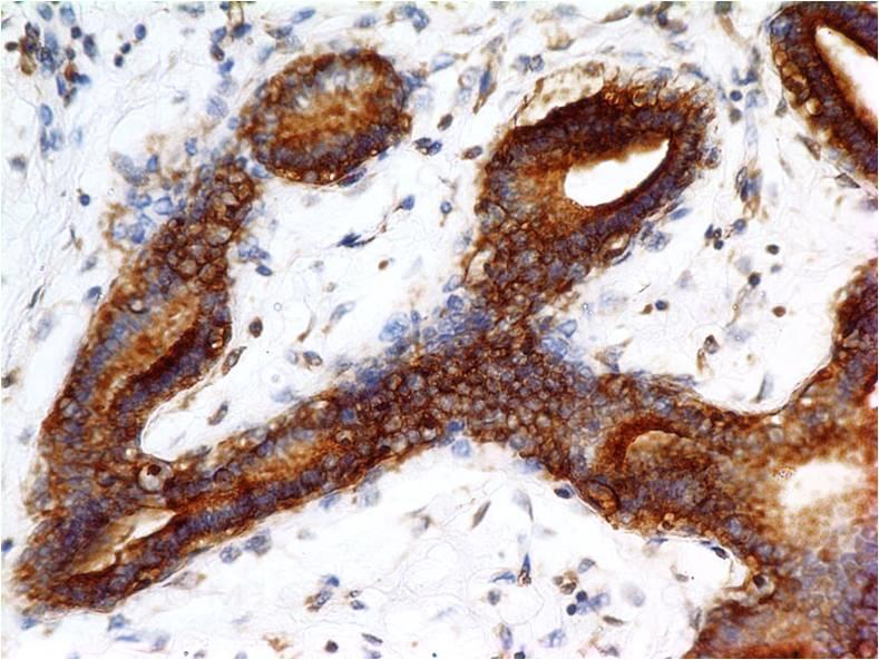 Fig-1: Immunohistochemical analysis of c-erbB2 in human Breast cancer tissue using c-erbB2 antibody (Clone: ABM45F5) at 5 µg/ml.